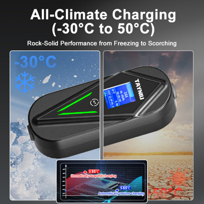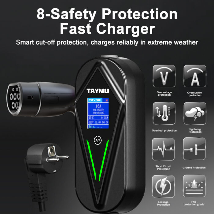 Tayniu VoltiX 3.5KW Portable EV Charger combines robust safety with intelligent features. Built with an IP66 rating and flame-retardant materials, it reliably operates in all weather. It safeguards your EV with overheat and overload protection. The clear electronic display allows you to adjust the current and set a charging schedule for off-peak savings. While it comes with a standard 5m cable, both cable length and plugs are customizable. This versatile charger is your ideal, dependable partner for convenient and safe charging anywhere.